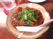 近鉄富雄駅西口からすぐ、カウンター5席と樽席のみの小さなバル。スタンドとあるが椅子はある。メニューは餃子、麻婆…