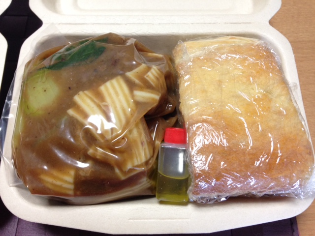通常メニューで人気の品をテイクアウトで。ダルバート(豆のスープ)付き。