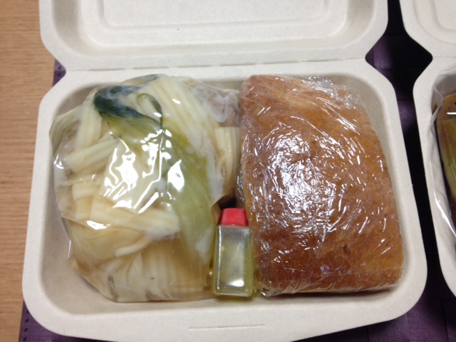 テイクアウトのお弁当。豆腐田楽が12個、味噌ダレをしみこませたご飯に乗せて。一品、漬物付き。